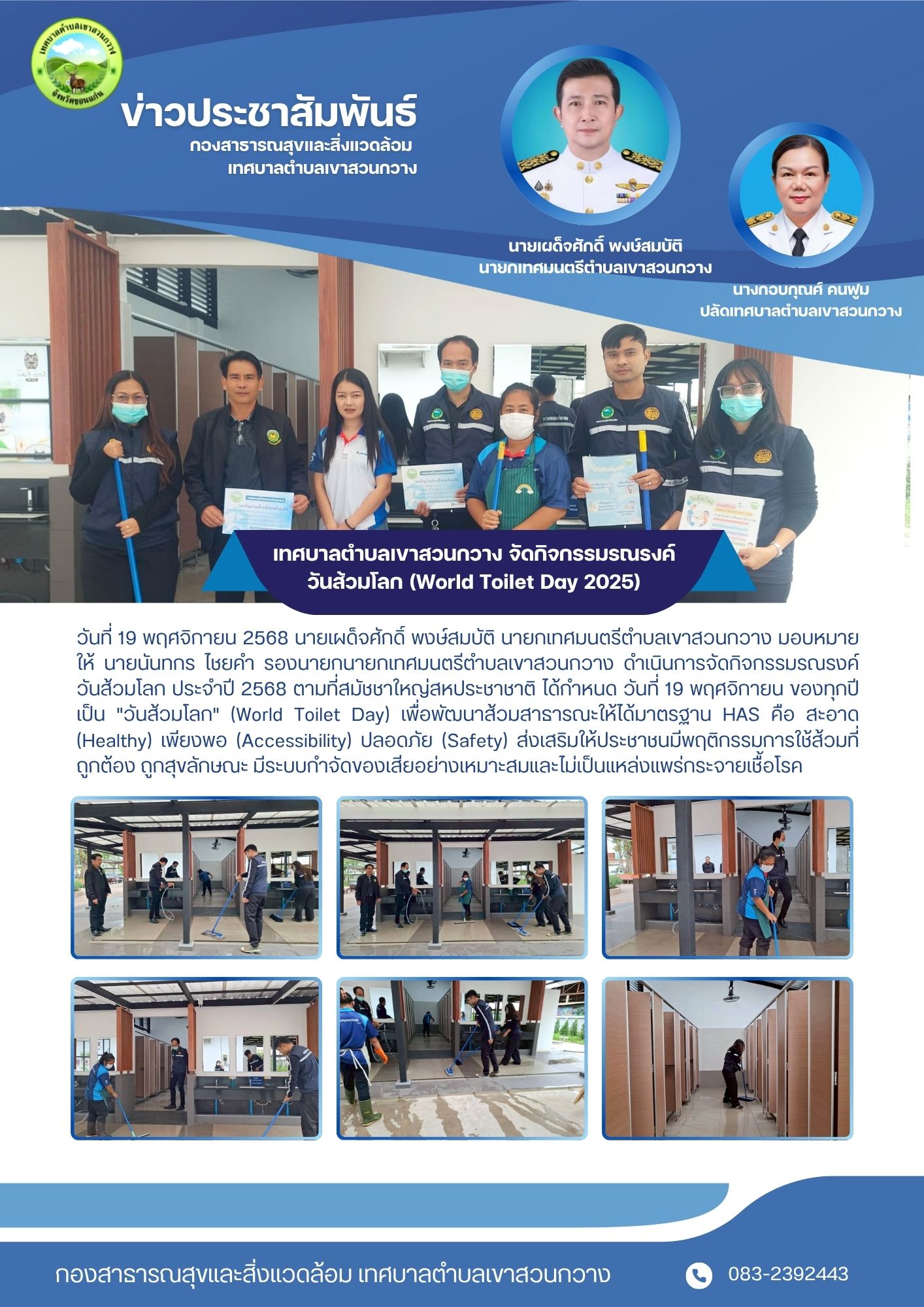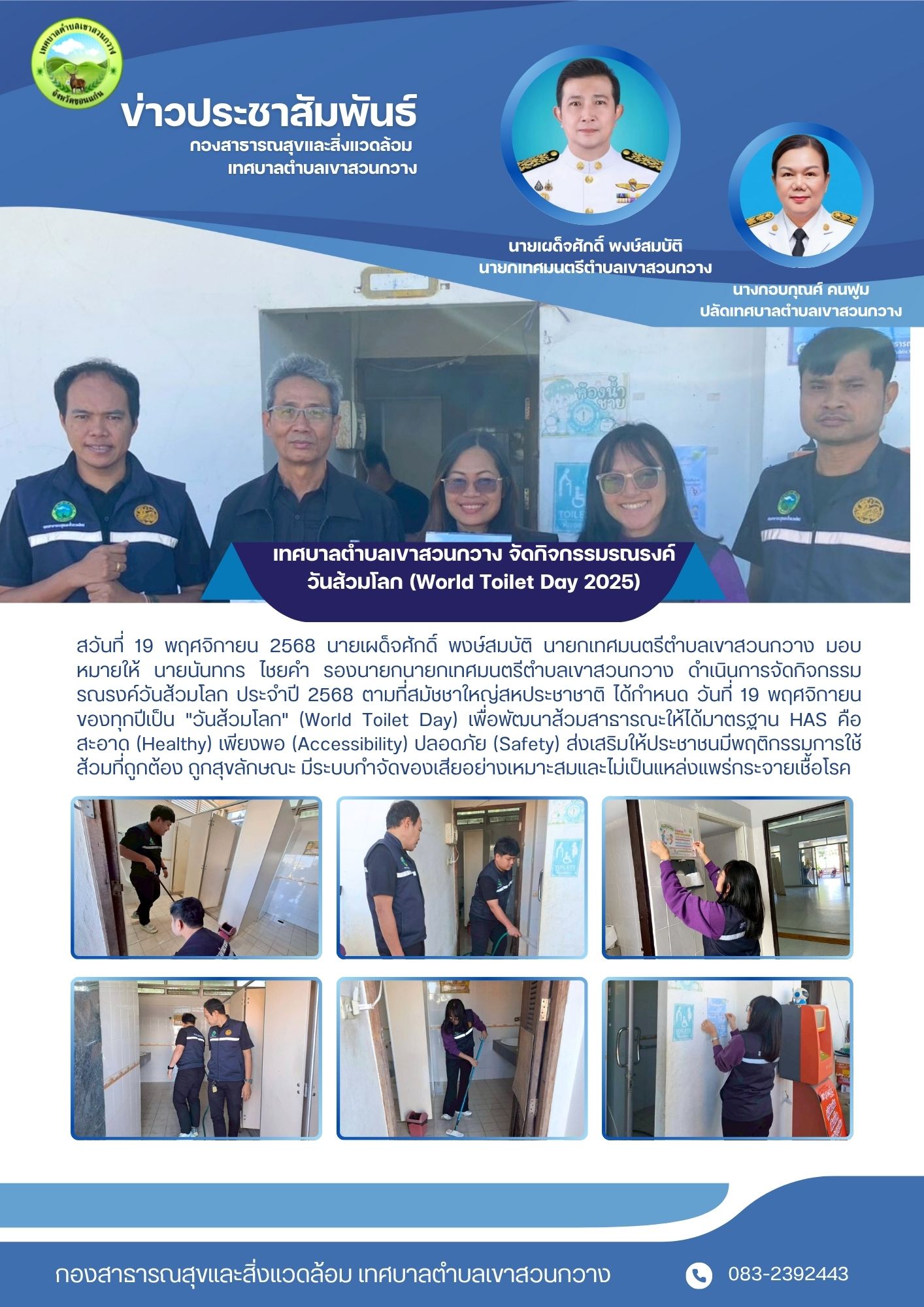 วันที่ 19 พฤศจิกายน 2568 นายเผด็จศักดิ์ พงษ์สมบัติ นายกเทศมนตรีตำบลเขาสวนกวาง มอบหมายให้ นายนันทกร ไชยคำ รองนายกนายกเทศมนตรีตำบลเขาสวนกวาง ดำเนินการจัดกิจกรรมรณรงค์วันส้วมโลก ประจำปี 2568 ตามที่สมัชชาใหญ่สหประชาชาติ ได้กำหนด วันที่ 19 พฤศจิกายน ของทุกปีเลงข่าว: 19/11/2568