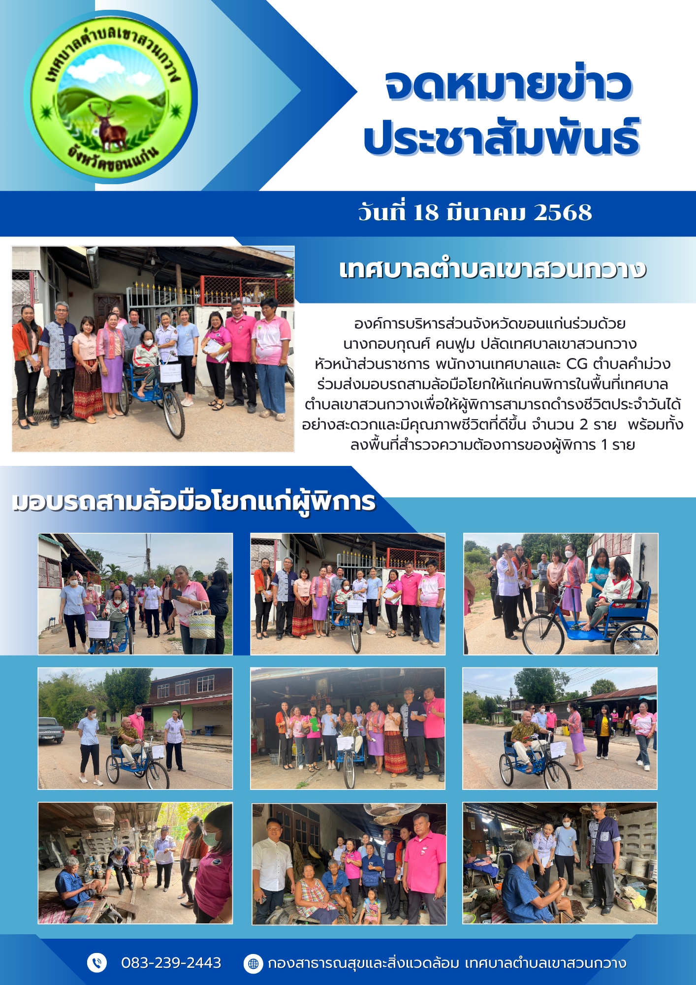 องค์การบริหารส่วนจังหวัดขอนแก่น ร่วมกับเทศบาลตำบลเขาสวนกวาง นำโดยนางกอบกุณศ์ คนฟูม ปลัดเทศบาลตำบลเขาสวนกวาง พร้อมด้วย หัวหน้าส่วนราชการ พนักงานเทศบาล และ CG มอบรถสามล้อมือโยกให้แก่ผู้พิการในพื้นที่เขตเทศบาลตำบลเขาสวนกวางลงข่าว: 18/03/2568