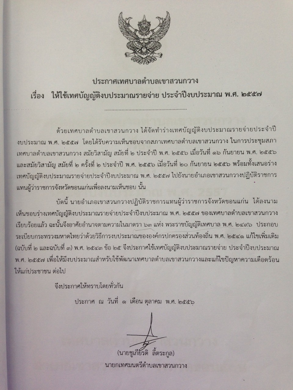 ให้ใช้เทศบัญญัติงบประมาณรายจ่าย ประจำปีงบประมาณ พ.ศ. 2557