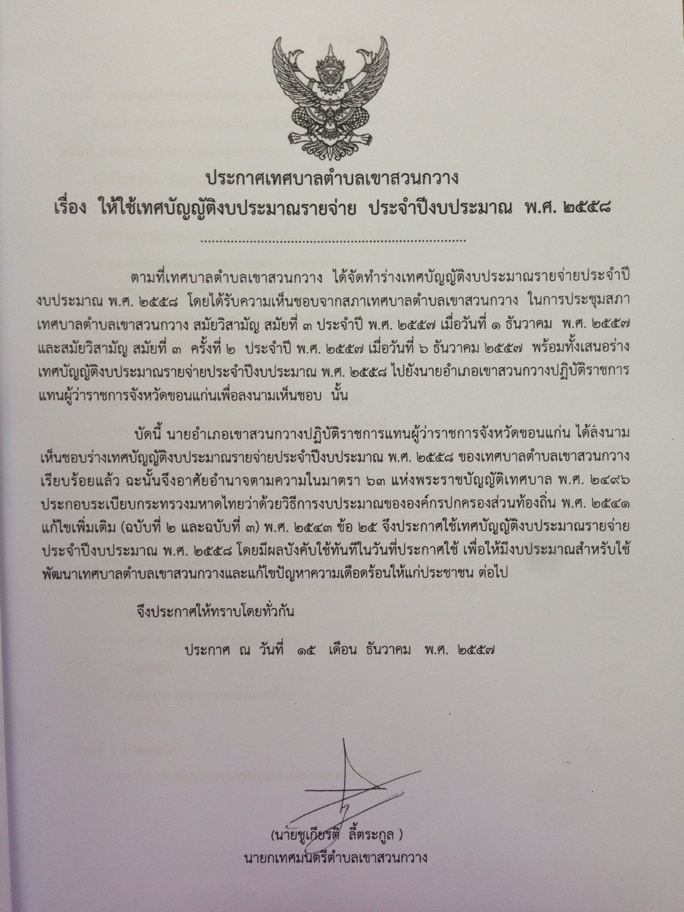 ให้ใช้แผนพัฒนาสามปีเทศบาลตำบลเขาสวนกวาง พ.ศ. 2558 -2560