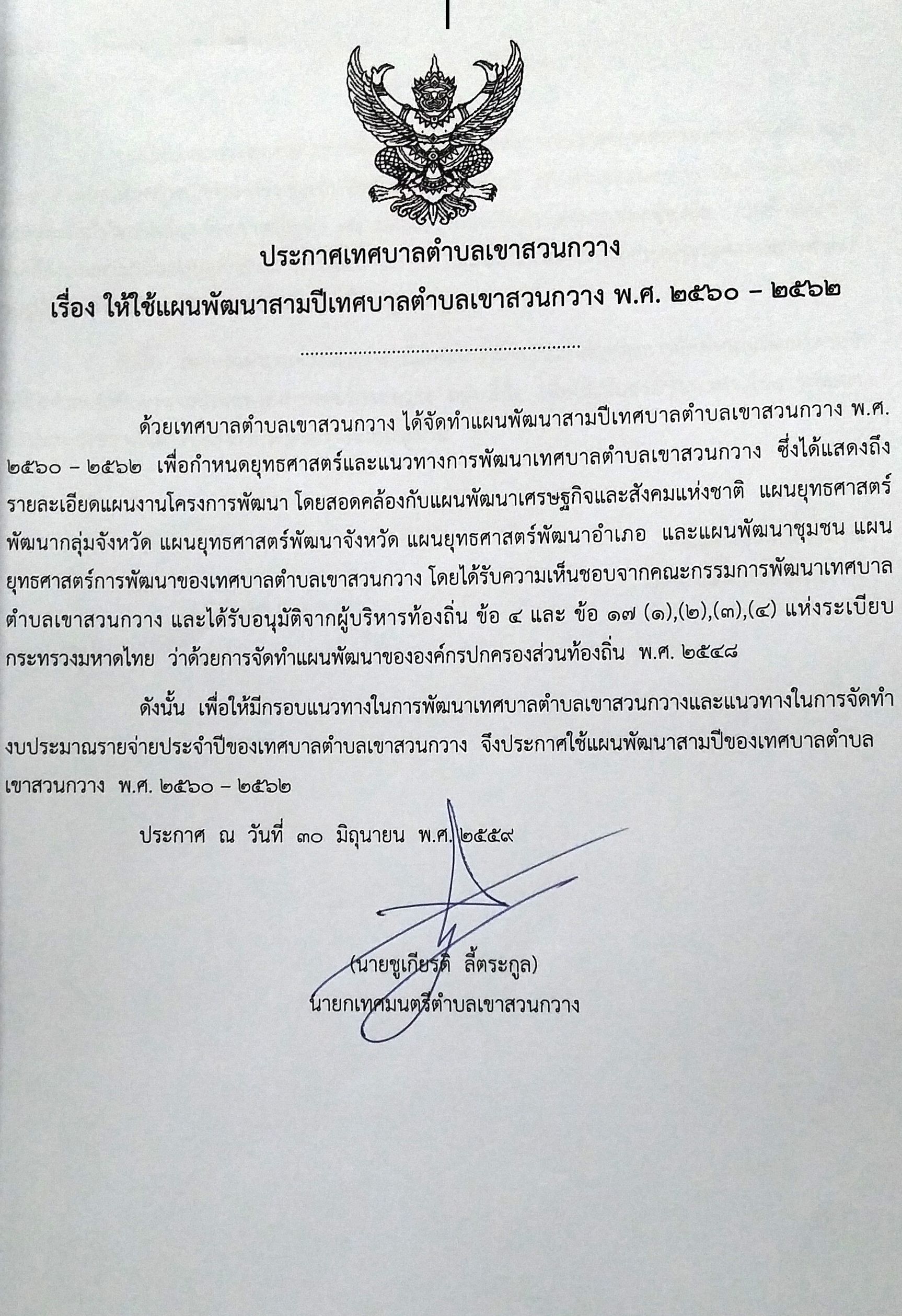 ให้ใช้แผนพัฒนาสามปีเทศบาลตำบลเขาสวนกวาง พ.ศ. 2560 - 2562