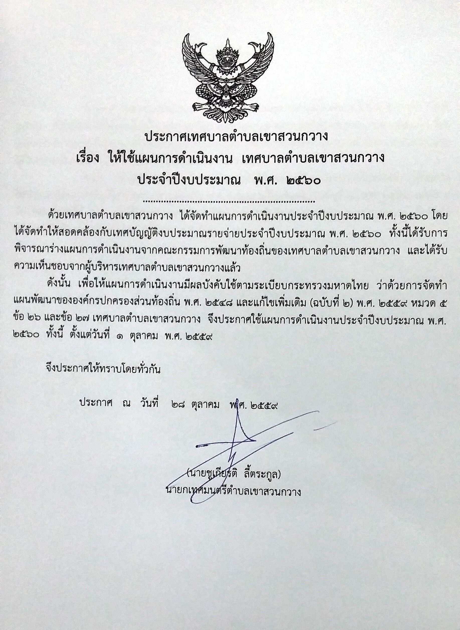 ให้ใช้แผนการดำเนินงาน เทศบาลตำบลเขาสวนกวาง ประจำปีงบประมาณ พ.ศ. 2560
