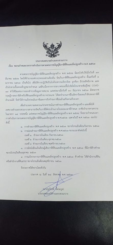 ขยายกำหนดเวลาการดำเนินการตามพระราชบัญญัติภาษีที่ดินและสิ่งปลูกสร้าง พ.ศ.2563