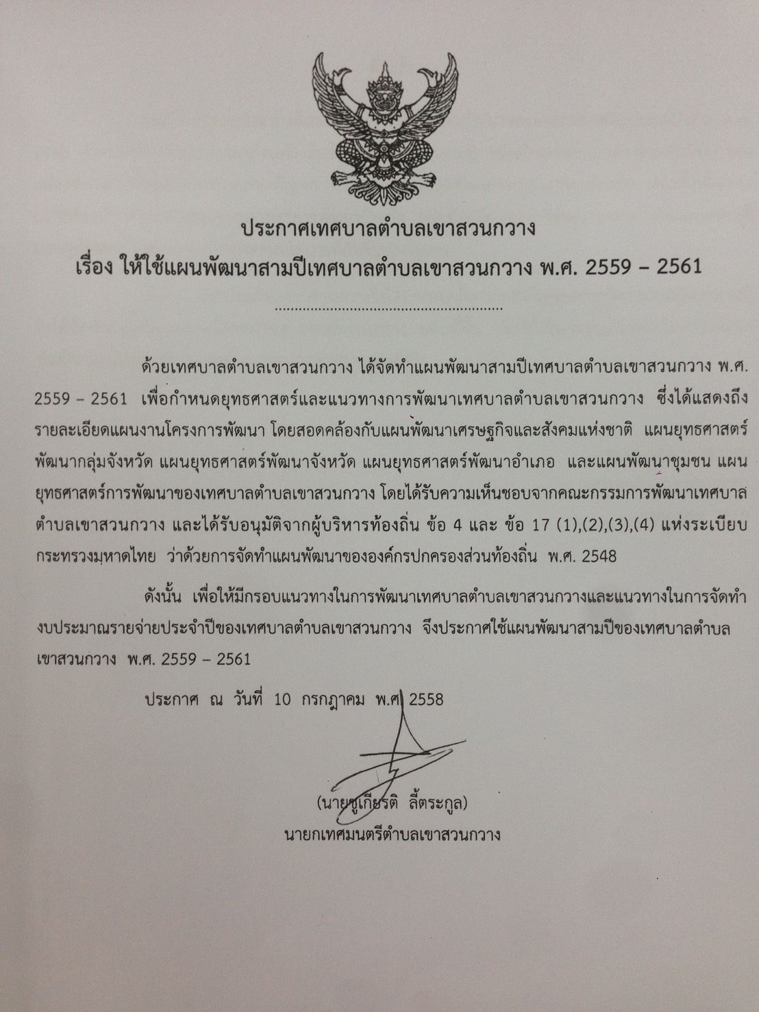 ให้ใช้แผนพัฒนาสามปีเทศบาลตำบลเขาสวนกวาง พ.ศ. 2559-2561