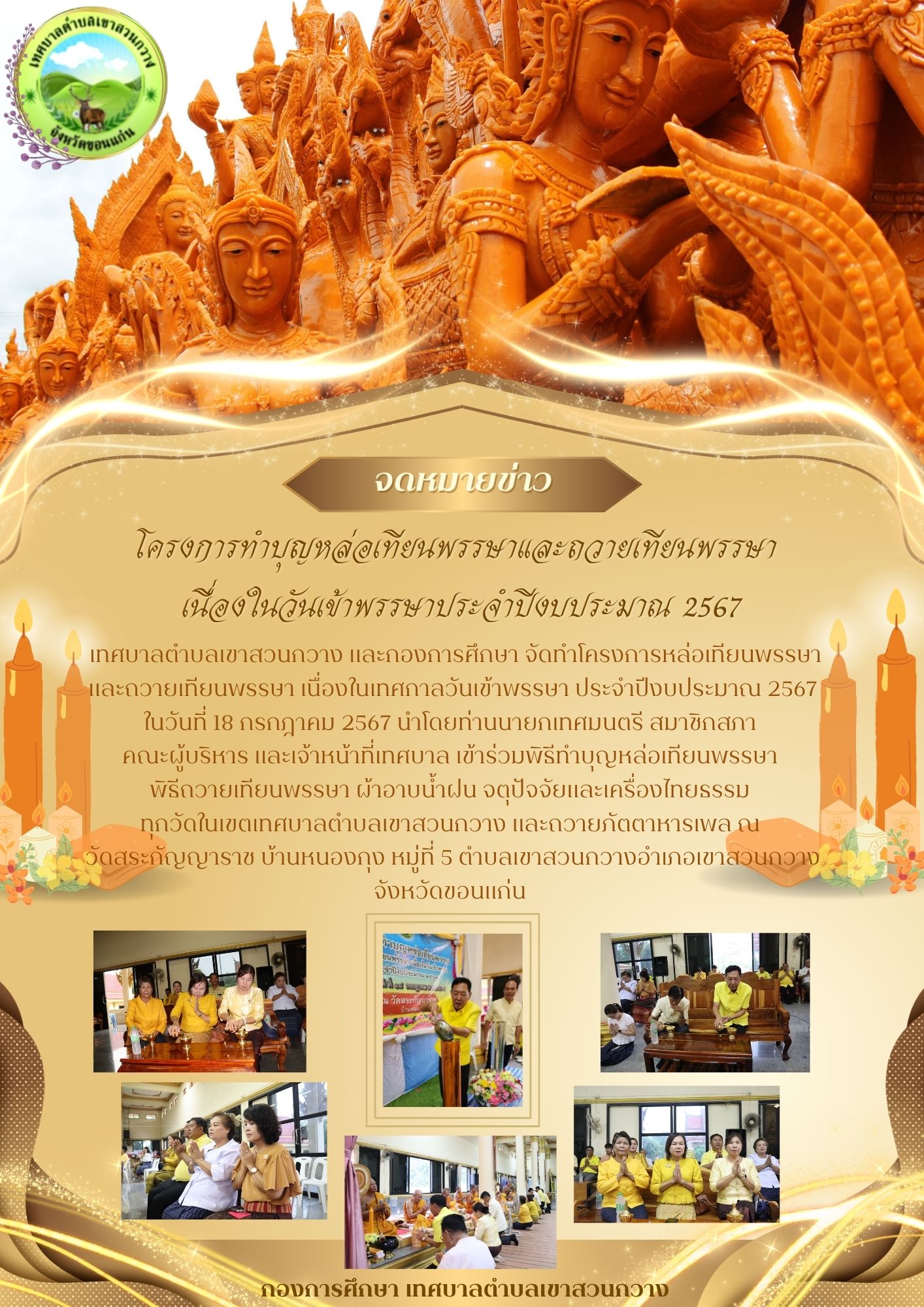 เทศบาลตำบลเขาสวนกวาง และกองการศึกษา จัดทำโครงการหล่อเทียนพรรษาและถวายเทียนพรรษา เนื่องในเทศกาลวันเข้าพรรษา ประจำปีงบประมาณ 2567 ในวันที่ 18 กรกฎาคม 2567