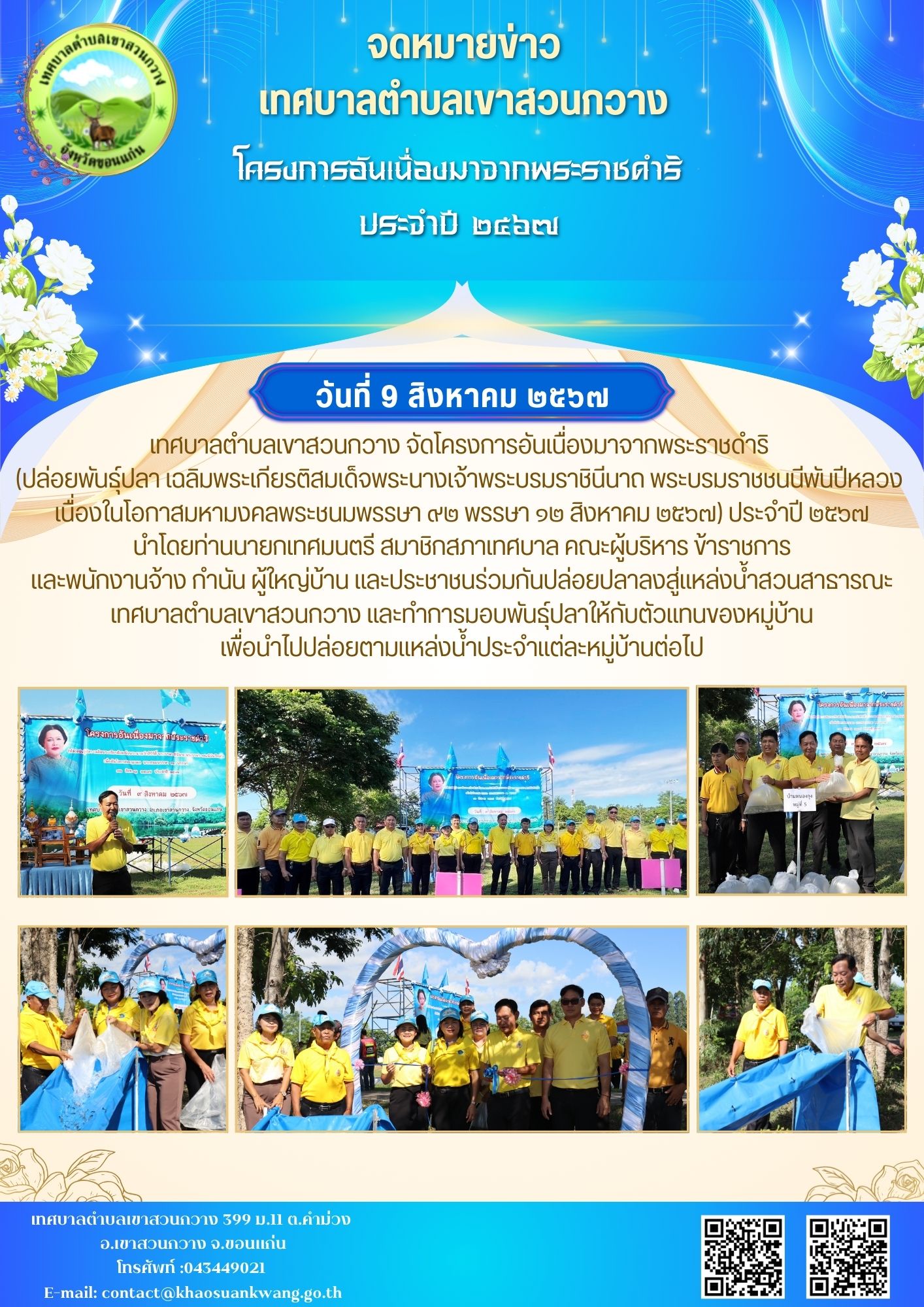 โครงการอันเนื่องมาจากพระราชดำริ (ปล่อยพันธุ์ปลา เฉลิมพระเกียรติสมเด็จพระนางเจ้าพระบรมราชินีนาถ พระบรมราชชนนีพันปีหลวง เนื่องในโอกาสมหามงคลพระชนมพรรษา ๙๒ พรรษา ๑๒ สิงหาคม ๒๕๖7) ประจำปี ๒๕๖๗ลงข่าว: 21/08/2567